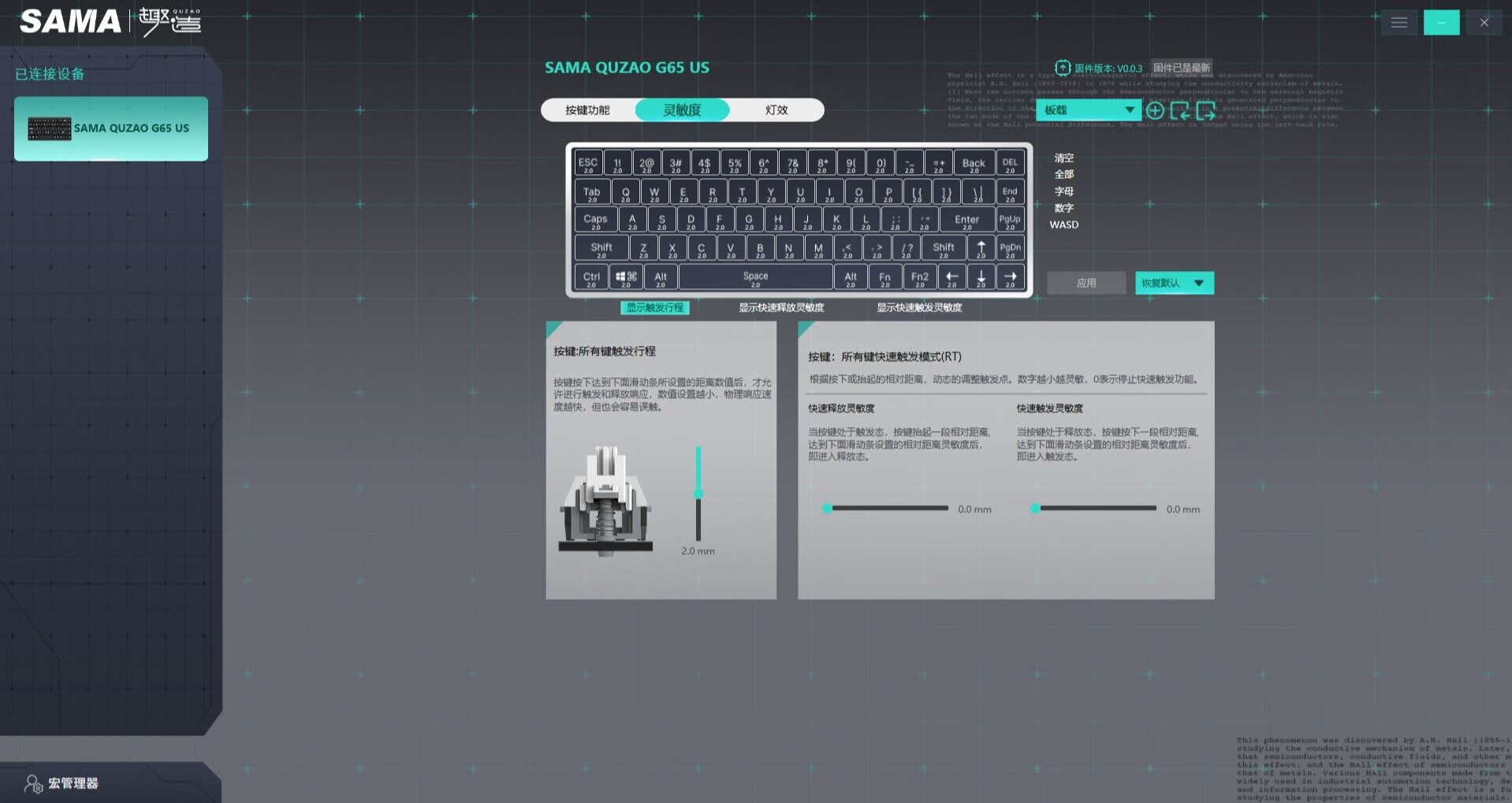 ▼这款键盘采用磁轴,可以自由的设置触发高度和复位响应敏感度,需要搭配驱动程序来设置。驱动程序的界面非常的简单、清晰,左侧是键盘型号,右侧是设置内容,设置内容分为三个主菜单,分别是按键功能、灵敏度、灯效,在按键功能界面,可以设置每个键位的功能,还可以设置宏和复用键位。