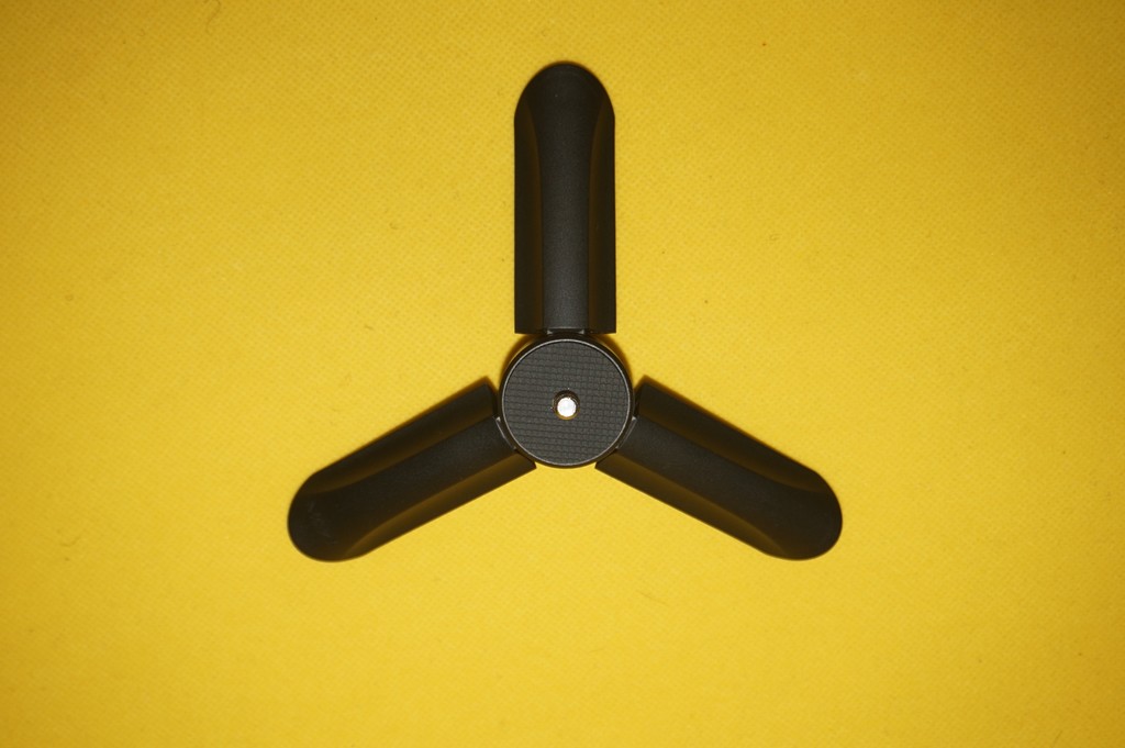 魔爪(MOZA)MINI-S稳定器底部一改普通的水平设计,而是借鉴比萨斜塔的设计,采用了坡度的造型,使手持时中心更加平衡,如果需要摆拍,只使用将配备的外接三脚架,与底部的1/4英寸的标准螺纹孔连接即可。
