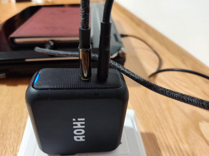 两脚折叠插头设计的AOHI Magcube PD 100W 插起来很轻松,指示灯具备蓝、绿、黄三种颜色状态,关灯后也可以了解设备的充电情况,方便不刺眼。空载和充满电状态亮绿灯(防过充)