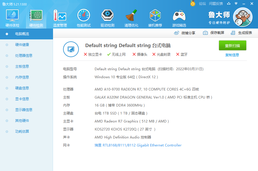 ▲这次使用的硬件配置是AMD A10-9700处理器,GALAX A320M主板,更换上博帝蟒龙内存套装后,大师识别出16GB的博帝 DDR4 3600MHz。