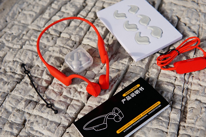 下面来一张全家福,除了南卡NEO骨传导耳机本体之外,还有三副不同尺寸的音质增强器、降噪耳塞、稳固皮筋、无线充电器及说明书。