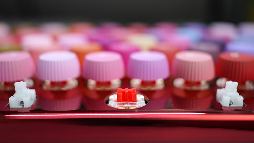 提到彩妆,你能想到什么?色彩丰富是必然的。雷柏ralemoPre5彩妆版提供了两种色系,一个是红色,一个是紫色。本次分享的是红色红轴的版本,官方对颜色的名称为胭红彩韵