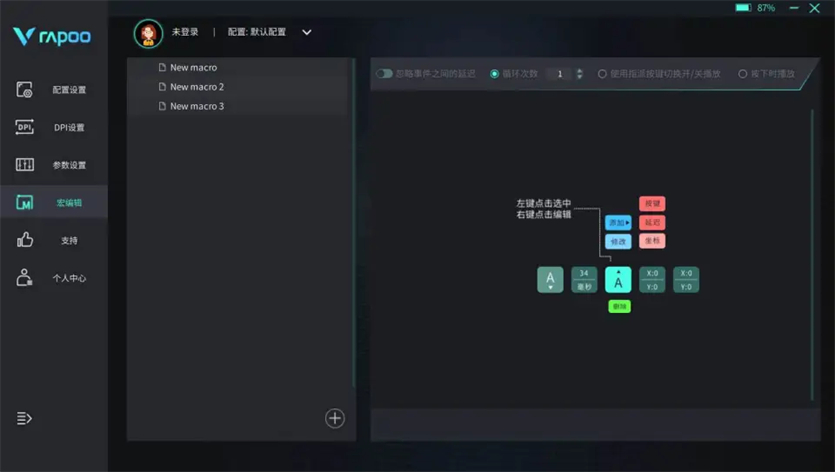游戏鼠标最重要的宏设置在第三大项,用宏辅助有助于游戏操作比如射击类游戏辅助压枪,lol辅助走位等,能给游戏体验带来巨大提升。
