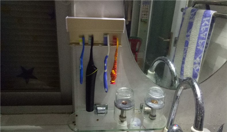 总结对于这款牙刷杀菌器说下使用心得和改善方向吧!总体来说操作比较简单。每次使用牙刷完毕直接按压侧面开关可以开启紫外线照射杀菌,3分钟后自动定时关闭。6孔牙刷摆放位置可以实现全家人的需求。当然了部分细节值得注意一下。比如官方附赠的双面背胶材质粘附性较差,拆装杀菌器还没3~5次,第二天就发现已经脱落下来。可能瓷砖表面比较光滑以及卫生间湿气较多的缘故吧!最终还是使用热熔胶直接固定在墙面上。对于今后杀菌器的充电方式,看来只能使用移动电源插入来进行了。这里还是建议官方能否考虑一下使用壁挂孔方式进行安装。毕竟这个东西有一定的份量加上经常移除充电会影响到双面胶贴的寿命。另外,紫外线工作中照射方式是不是有待再次验证其可行性,透明的塑料保护板已经严重影响了紫外线照射强度,能否穿透到牙刷本体进行可靠的杀菌值得商榷。后续升级板的杀菌器能否考虑增加自动模式。智能产品的出现对于每个人来说应该都很喜欢。摆脱手动方式而通过自动定时触发的工作模式,这难道不是现代人所追求的一种生活方式吗?