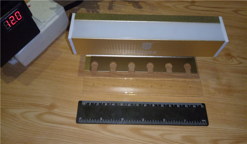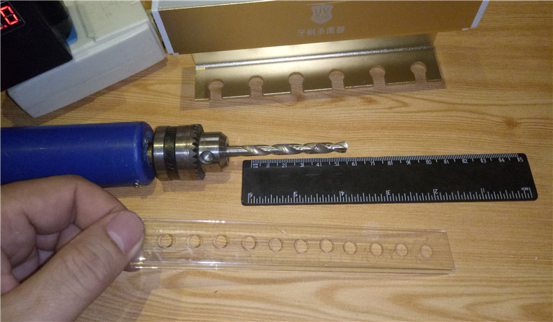 看来想要让杀菌器真正起到紫外线照射的功效,这个透明保护板有必要改装一下。不装肯定不行,牙刷取放一不小心容易磕碰破损灯管。拿出钻孔器对透明塑料板等距离开孔处理。再看看效果,很显然镂空的保护板这个方案还是有效的。