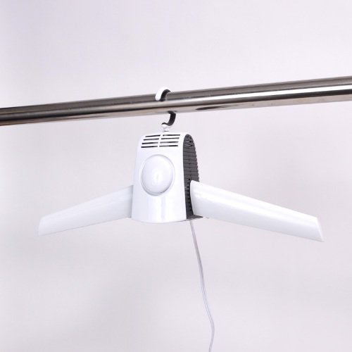 这款产品其实是同时将干衣机及衣架两者给合,衣架中央位置设有一个干衣机,而支架位的下方则设有多个出风口,只要将各种衣物挂在上面,然后再按下中间的开关,接着出风口便会喷出暖风吹干衣服。 此外,该干衣架也可以用来烘干各种鞋。
